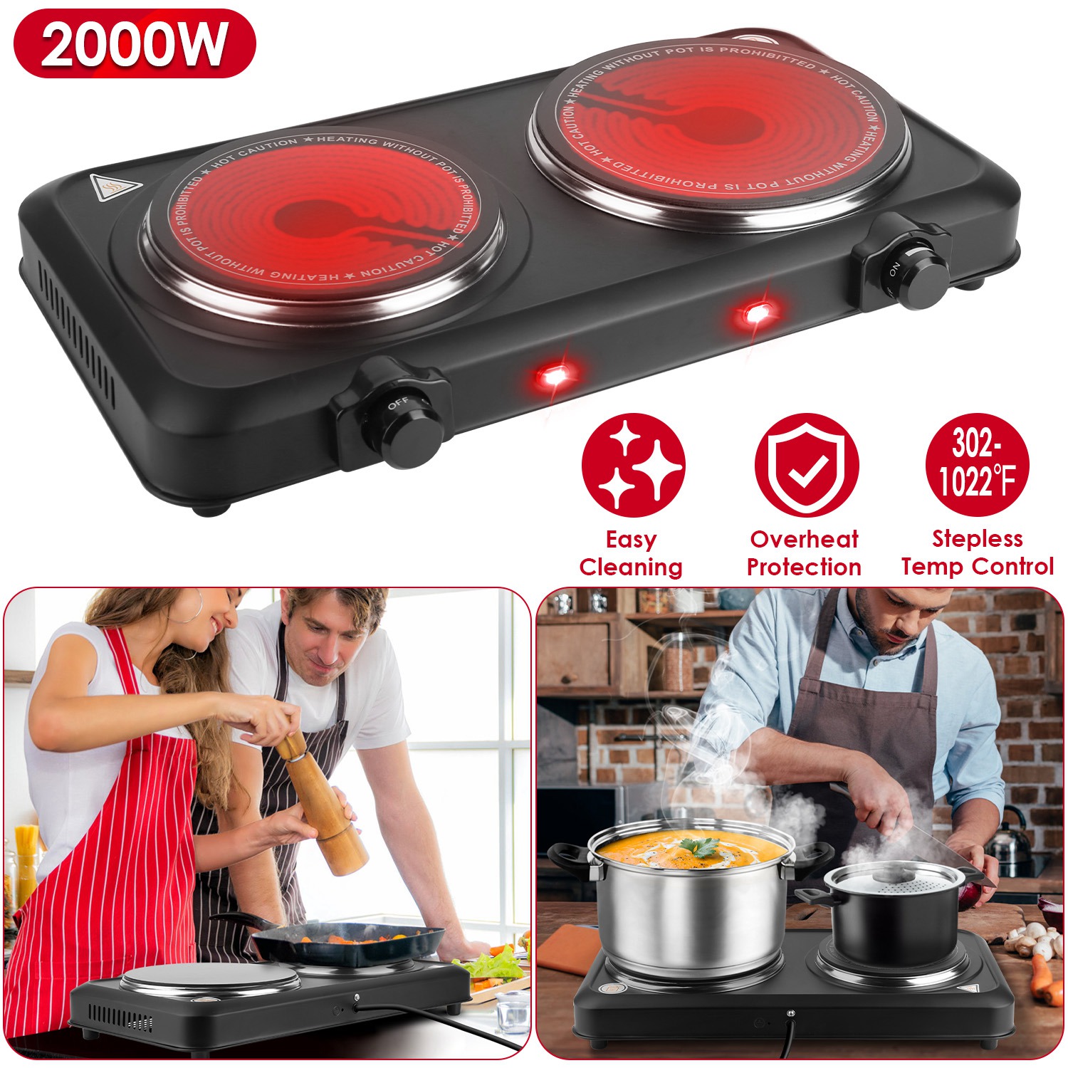 This compact infrared dual burner is great for events and traveling! The lightweight and compact design allows for easy storage and carrying. The hot plate burner with special infrared technology distributes heat quickly and evenly for great performance at 302-1022℉ stepless adjustable temperature. 7.5in-Diameter & 6.3in-diameter glass heating plates make it suitable for most cookware with diameter≤7.5in/6.3in, such as frying pans, woks or stovetop teapots made from aluminum, stainless steel, iron, glass, etc.. Perfect for camping, student accommodation, holiday homes, caravans, campers, offices or as an extra cooking surface in a busy kitchen. A sleek clean black finish adds style and a sleek appearance to this wonderful kitchen addition!