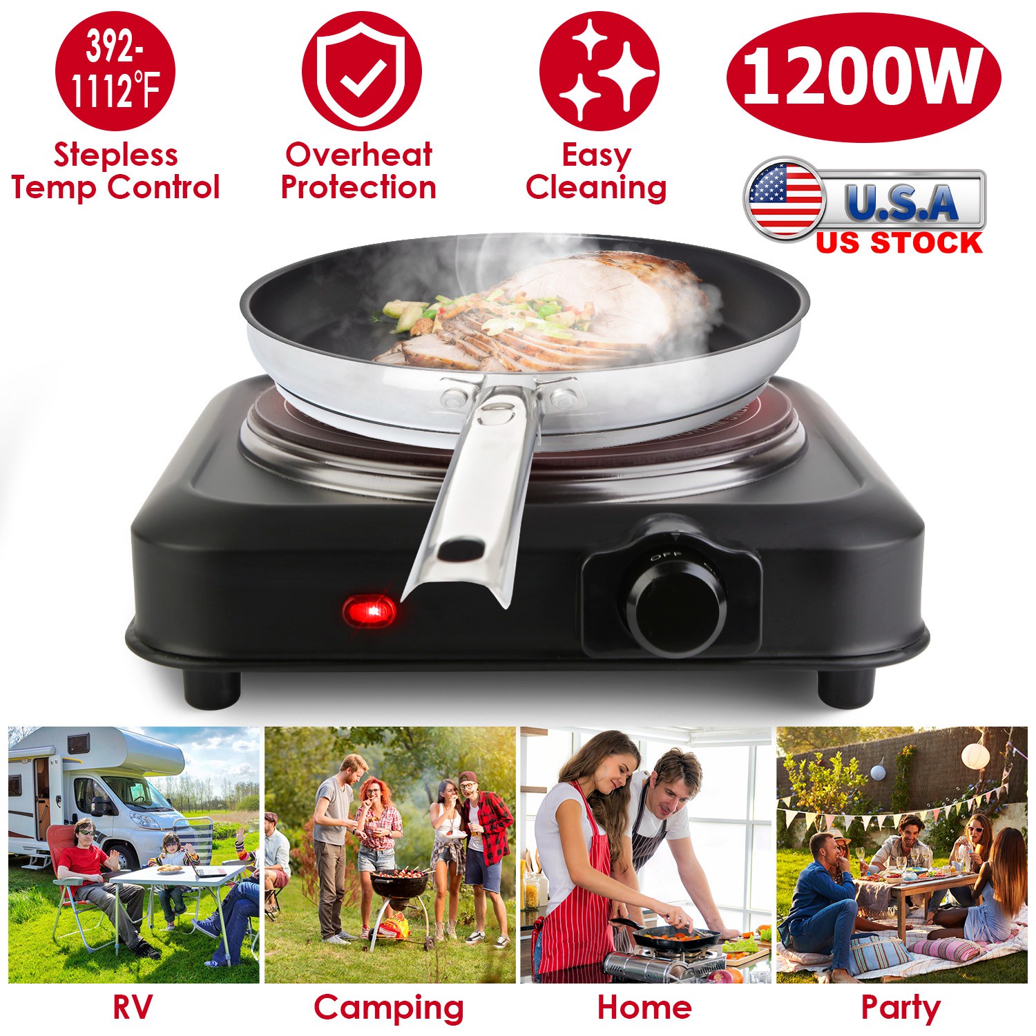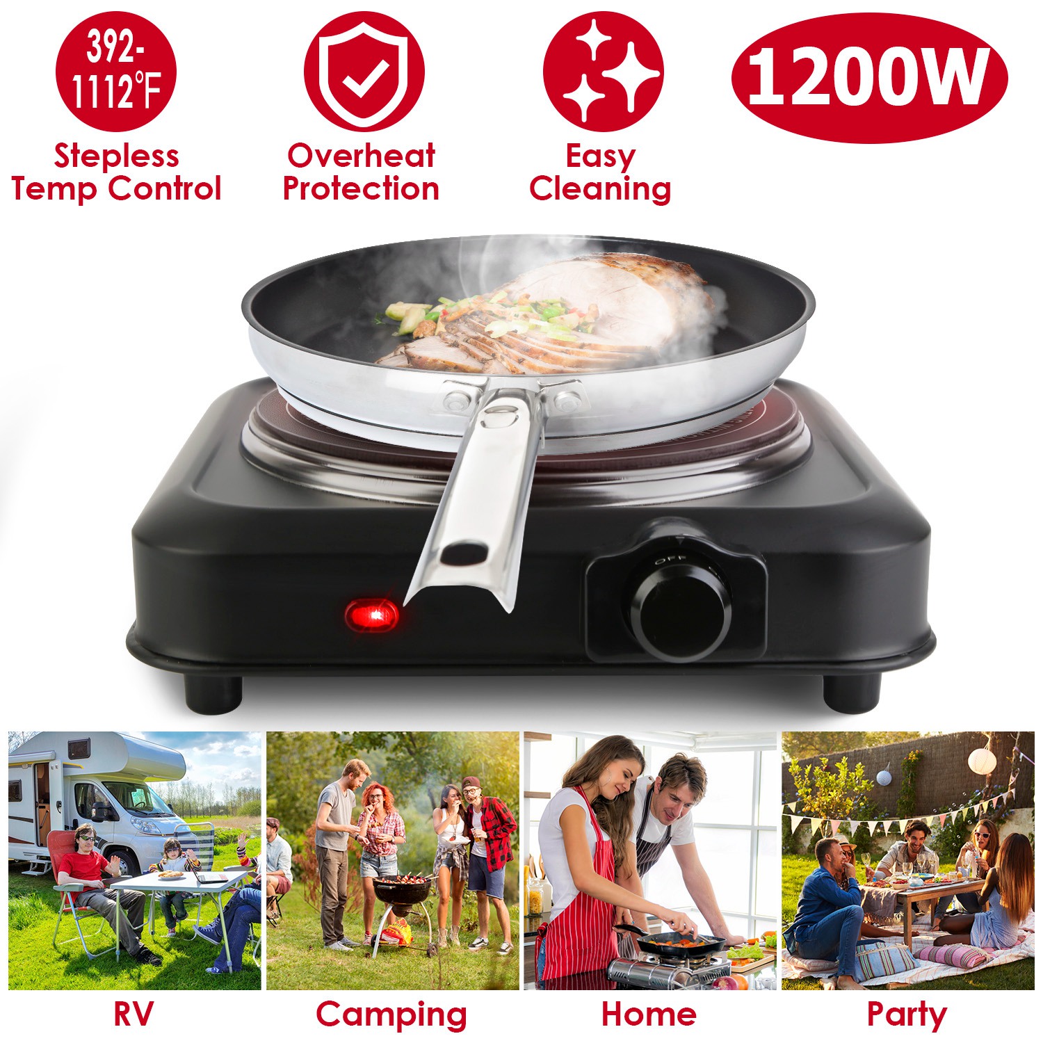 This compact infrared single burner is great for events and traveling! The lightweight and compact design allows for easy storage and carrying. The hot plate burner with special infrared technology distributes heat quickly and evenly for great performance at 392-1112℉stepless adjustable temperature. 7.5in-Diameter glass heating plate makes it suitable for most cookware with diameter≤7.5in, such as frying pans, woks or stovetop teapots made from aluminum, stainless steel, iron, glass, etc.. Perfect for camping, student accommodation, holiday homes, caravans, campers, offices or as an extra cooking surface in a busy kitchen. A sleek clean black finish adds style and a sleek appearance to this wonderful kitchen addition!