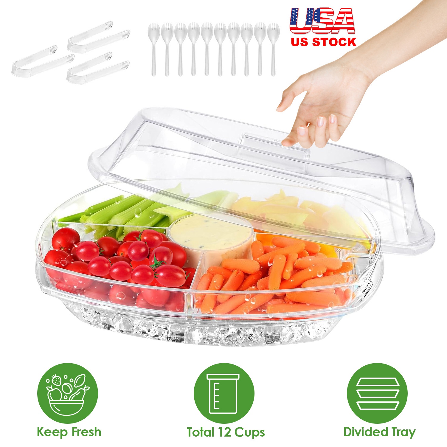 This Fruit Ice Serving Tray with 4 divided parts is perfect to keep some fruits, vegetables, cold cuts, relishes, Shrimp, meat, sushi, dips and appetizers fresh. Simply put the food in the divided top tray, fill the bottom tray with ice and cover with the clear lid to keep food cold and fresh, perfect for outdoor parties. Clear design allows you to check the inside food fresh or not anytime. We also provide you with 3 tongs and 10 sporks, easy to take the serving tray set to anywhere. Meet most of your needs in the party.